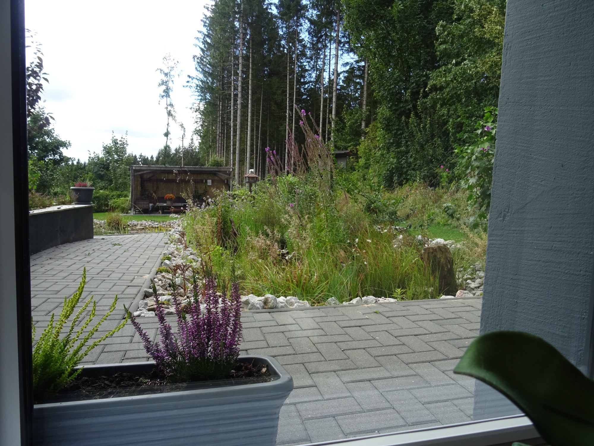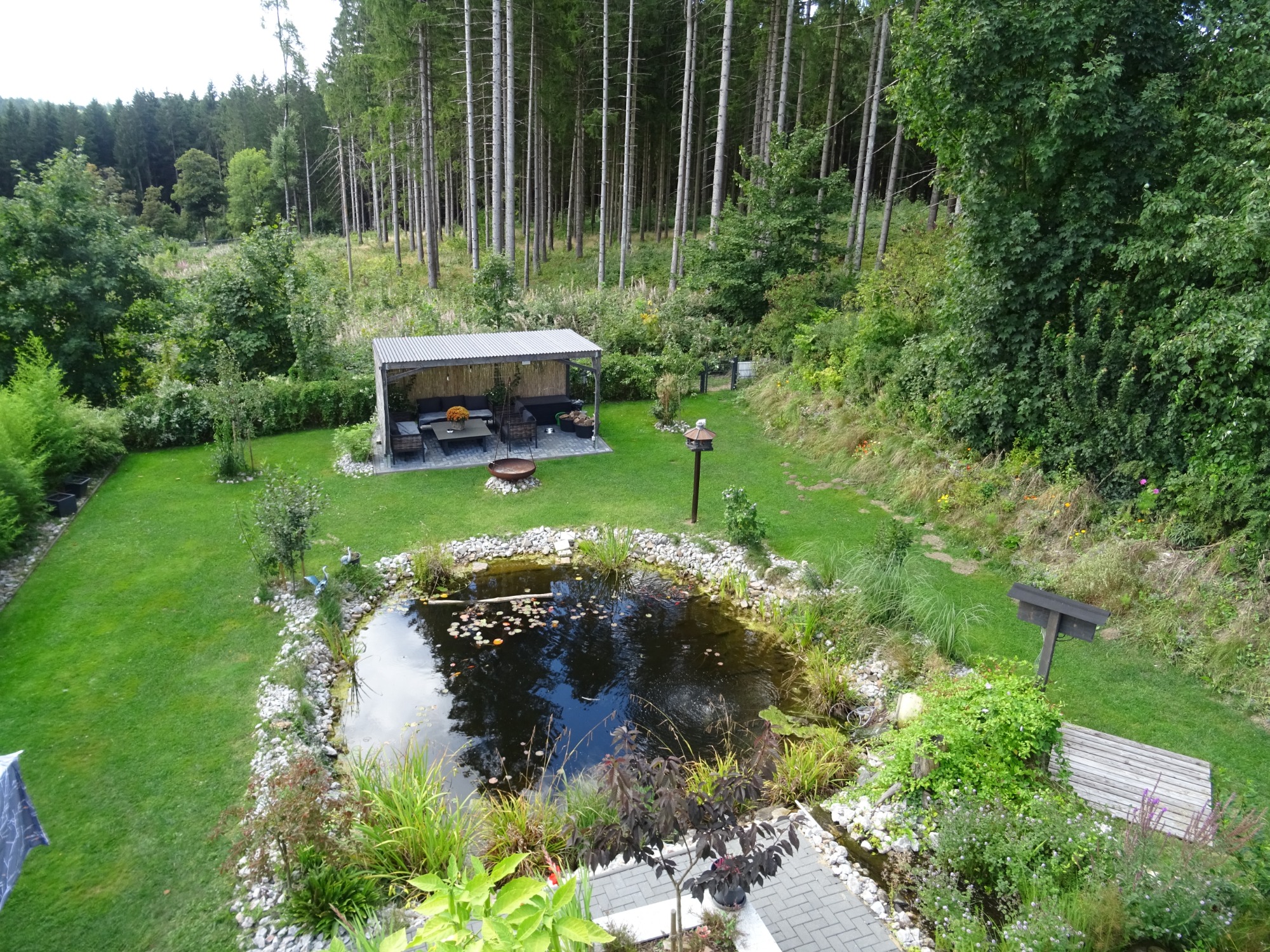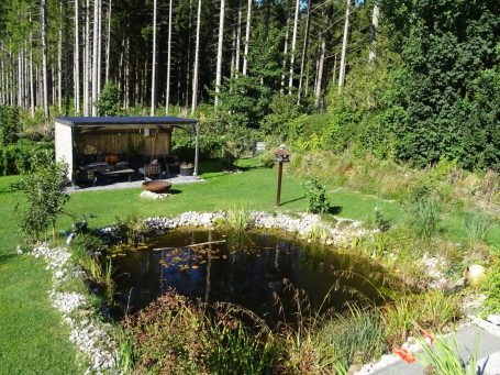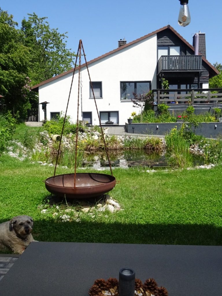 Unser Garten wurde im Sommer 2024 nochmal komplett neu angelegt. Der Teich wurde vergrößert, eine Sumpfzone angelegt. Der Garten wurde komplett eingefriedet, so dass Hunde frei laufen können.