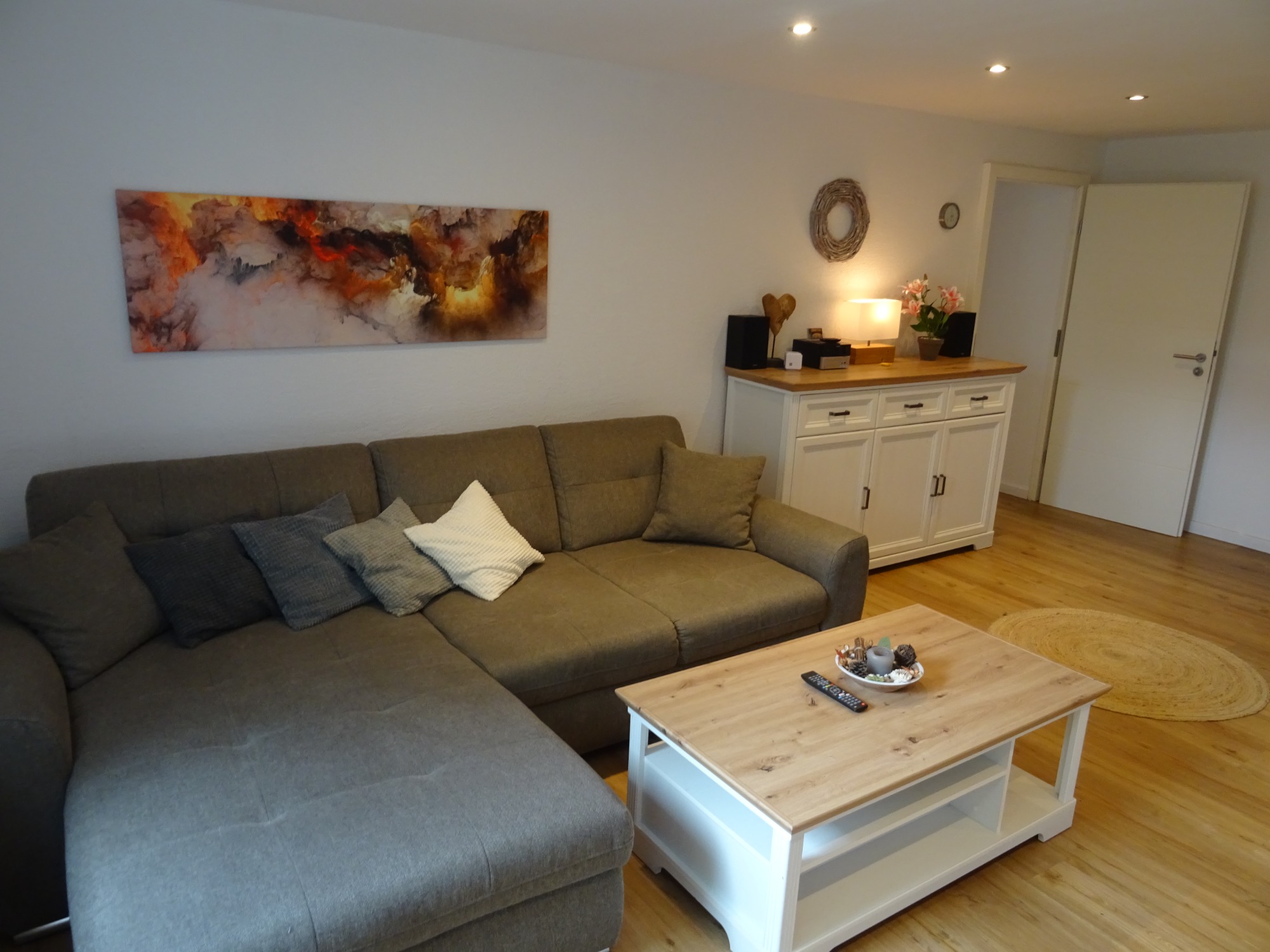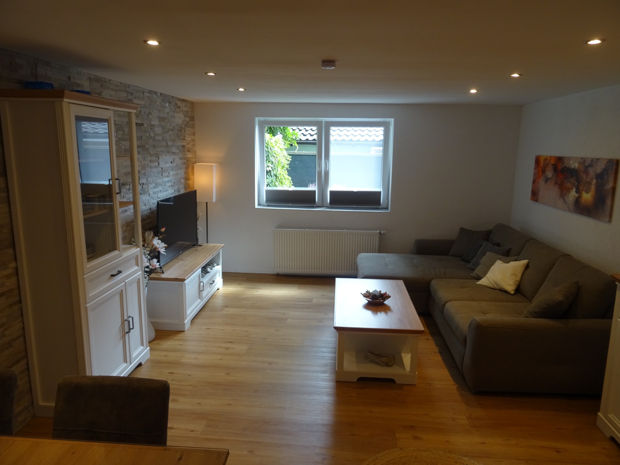 Wohnzimmer mit Essbereich für 4-5 Personen. Sofa mit Schlaffunktion für 2 Pers. Smart-TV mit Netflix.