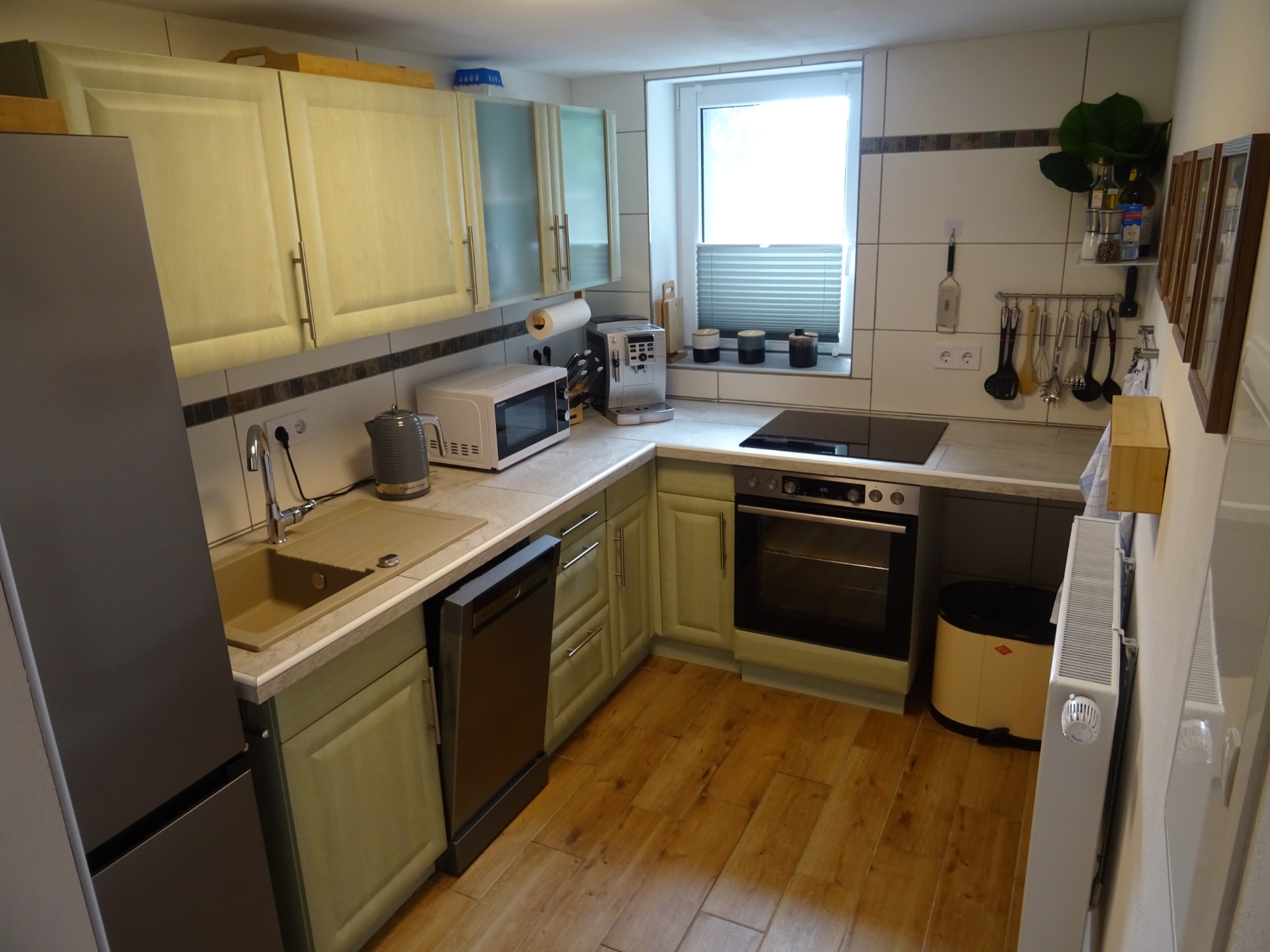 Küche mit Geschirrspüler, Kühlschrank, Ceranfeld & Ofen, und Kaffeevollautomat mit Kaffeebohnen.