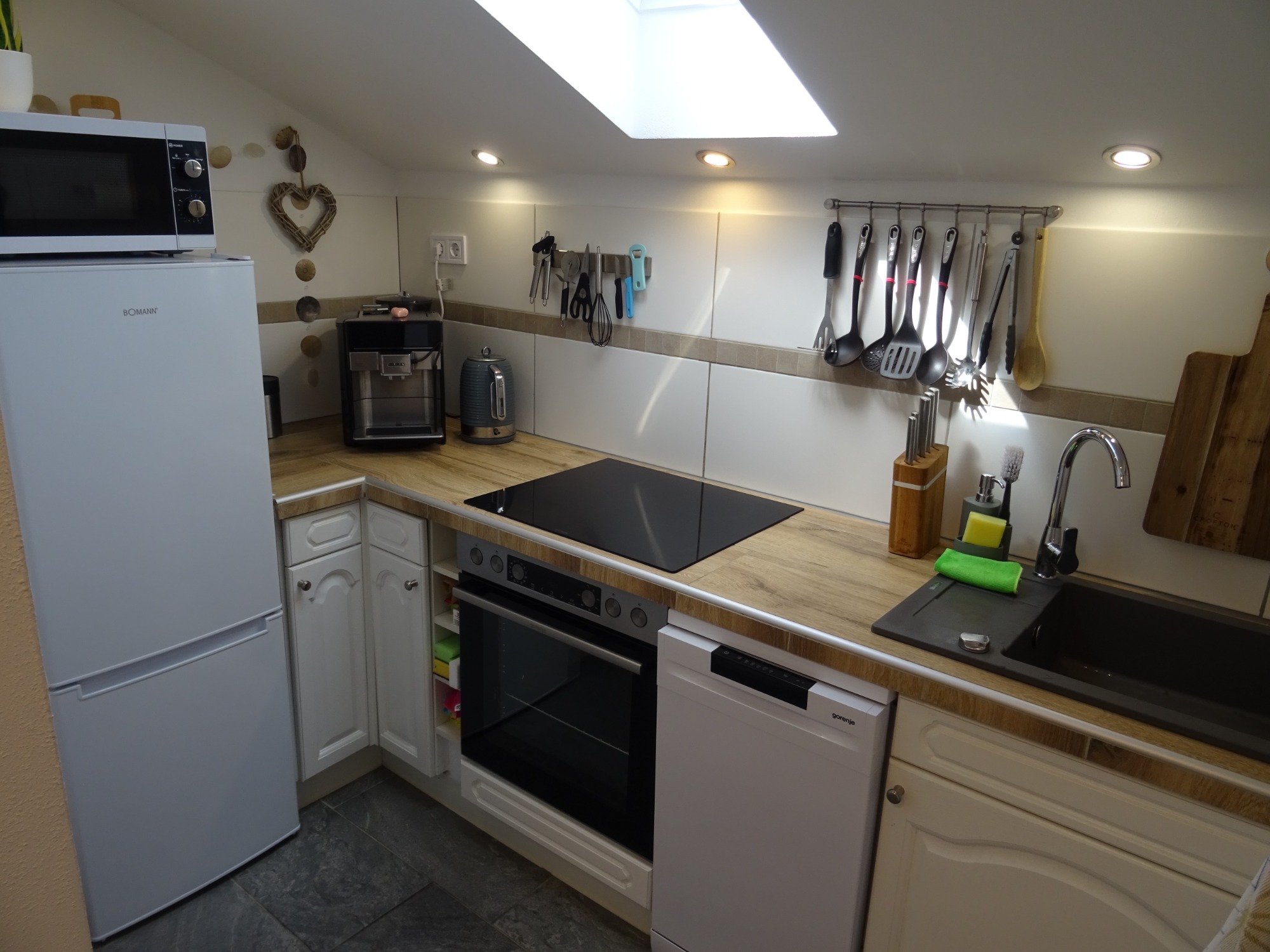Küche mit Geschirrspüler und Kaffeevollautomat mit Kaffebohnen und allen Kleinigkeiten.